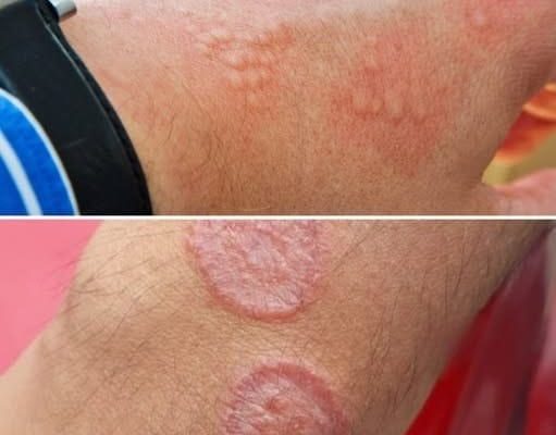 - Red, scaly patches with raised edges
